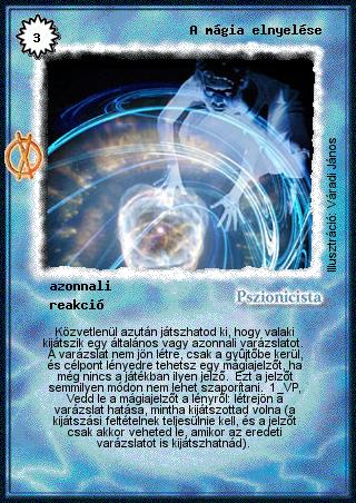 Kiadás: Hatalom Szövetsége Gyakoriság: ritka Lapszín (isten): Pszionicista Klán Típus: azonnali Altípus: reakció Szöveg: Közvetlenül azután játszhatod ki, hogy valaki kijátszik egy általános vagy azonnali varázslatot. A varázslat nem jön létre, csak a gyűjtőbe kerül, és célpont lényedre tehetsz egy mágiajelzőt, ha még nincs a játékban ilyen jelző. Ezt a jelzőt semmilyen módon nem lehet szaporítani. 1 VP, Vedd le a mágiajelzőt a lényről: létrejön a varázslat hatása, mintha kijátszottad volna (a kijátszási feltételnek teljesülnie kell, és a jelzőt csak akkor veheted le, amikor az eredeti varázslatot is kijátszhatnád). Illusztráció: Váradi János