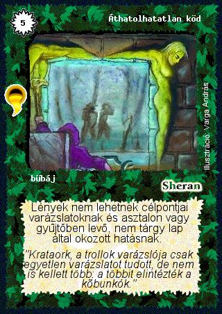 Kiadás: Aranyforrás Gyakoriság: ritka Lapszín (isten): Sheran Típus: bűbáj Szöveg: Lények nem lehetnek célpontjai varázslatoknak és asztalon vagy gyűjtőben levő, nem tárgy lap által okozott hatásnak. Szinesítő szöveg: "Krataork, a trollok varázslója csak egyetlen varázslatot tudott, de nem is kellett több: a többit elintézték a kőbunkók." Illusztráció: Varga András