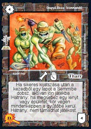 (AK111) Mi történik akkor, ha egy Öngyilkos kommandóra rakok egy Hűségesküt, és megütök vele egy lényt? A Hűségeskün nincs rajta ugyan, hogy hátrányra nem vonatkozik, vagyis működne a dolog, de sajnos a fránya Öngyilkos kommandó szövegében az szerepel, hogy mindenképpen a gyűjtőbe kerül. Ez alól pedig nem lehet kivétel.