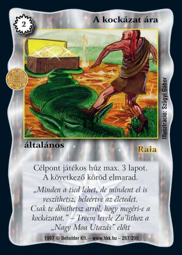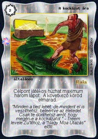 Kiadás: Létsíkok, Túlélők Földje Gyakoriság: ritka Lapszín (isten): Raia Típus: általános Szöveg: Célpont játékos húzhat maximum három lapot. A következő köröd elmarad. Szinesítő szöveg: "Minden a tied lehet, de mindent el is veszíthetsz, beleértve az életedet. Csak te dönthetsz arról, hogy megéri-e a kockázatot." - Treem levele Zu'lithoz, a "Nagy Moa Utazás" előtt Illusztráció: