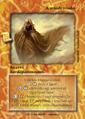 Kiadás: Kristályláz Gyakoriság: ultra ritka Lapszín (isten): Színtelen Típus: követő Altípus: hordaparancsnok Szöveg: A játékot 4 lappal kezded. (S), 1_VP: húzz 1 lapot! (K), 1_VP: aktivizálj vagy passzivizálj egy célpont lapot! (K2), (1): Semmizés: 1 vagy gyógyulsz 2-t. A 3. körtől minden egyes képessége megszüntethető 7-7 ÉP és max. ÉP feláldozásával. Illusztráció: Ruzsinszki Zsolt