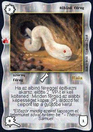 Kiadás: Ősi legendák Gyakoriság: nem gyakori Lapszín (isten): Raia Típus: szörny Altípus: féreg Szöveg: Ha az albinó féreggel építkezni akarsz, előtte 2 VP-t el kell költened. Minden férged az alábbi képességet kapja: (P), áldozd fel: célpont lap a gyűjtőbe kerül. Szinesítő szöveg: "Először mindig ezeket taposom el, tetemüket sóval hintem be." - Théroxi Sámuel Illusztráció: Szatmári Zsolt