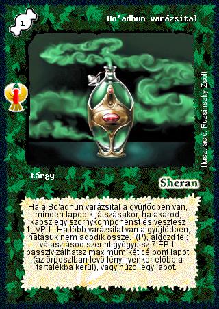 Kiadás: Ébredés Gyakoriság: ritka Lapszín (isten): Sheran Típus: tárgy Szöveg: Ha a Bo'adhun varázsital a gyűjtődben van, minden lapod kijátszásakor, ha akarod, kapsz egy szörnykomponenst és vesztesz 1 VP-t. Ha több varázsital van a gyűjtődben, hatásuk nem adódik össze. (P), áldozd fel: választásod szerint gyógyulsz 7 ÉP-t, passzivizálhatsz maximum két célpont lapot (az őrposztban levő lény ilyenkor előbb a tartalékba kerül), vagy húzol egy lapot. Illusztráció: Ruzsinszki Zsolt