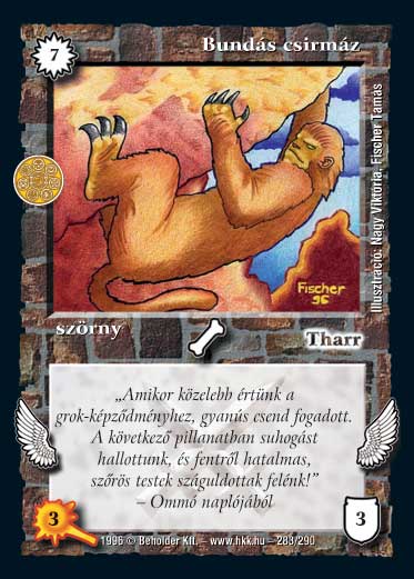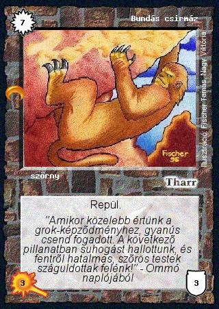 Kiadás: Chara-din visszatér, Túlélők Földje Gyakoriság: ritka Lapszín (isten): Tharr Típus: szörny Szöveg: Repül. Szinesítő szöveg: "Amikor közelebb értünk a grok-képződményhez, gyanús csend fogadott. A következő pillanatban suhogást hallottunk, és fentről hatalmas, szőrös testek száguldottak felénk!" - Ommó naplójából Illusztráció: Fischer Tamás, Nagy Viktória