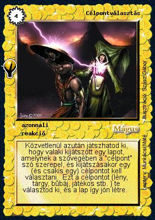 Kiadás: Alappakli, 5. kiadás (Ősök városa) Gyakoriság: ritka Lapszín (isten): Mágus Klán Típus: azonnali Altípus: reakció Szöveg: Közvetlenül azután játszhatod ki, hogy valaki kijátszott egy lapot, amelynek a szövegében a "célpont" szó szerepel, és kijátszásakor egy (és csakis egy) célpontot kell választani. Ezt a célpontot (lény, tárgy, bűbáj, játékos stb. ) te választod ki, és a lap így jön létre. Illusztráció: Szász Gábor Tervező: Munkácsi Máté