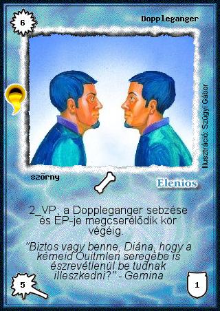 Kiadás: Aranyforrás Gyakoriság: ritka Lapszín (isten): Elenios Típus: szörny Szöveg: 2 VP: a Doppleganger sebzése és ÉP-je megcserélődik kör végéig. Szinesítő szöveg: "Biztos vagy benne, Diána, hogy a kémeid Ouitmlen seregébe is észrevétlenül be tudnak illeszkedni?" - Gemina Illusztráció:
