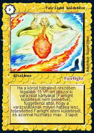 Kiadás: Alappakli, 1. kiadás, Alappakli, 2. kiadás, Alappakli, 3. kiadás Gyakoriság: ritka Lapszín (isten): Fairlight Típus: általános Szöveg: Ha a köröd hátralevő részében legalább 15 VP-ért játszol ki varázslat kártyákat (Fairlight küldetését nem beleértve), függetlenül attól, hogy a varázslatoknak milyen hatása lesz, teljesítetted Fairlight isteni küldetését, és azonnal húzhatsz max. 3 lapot. Illusztráció: