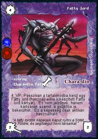 Kiadás: Sötét Föld (Invázió) Gyakoriság: ritka Lapszín (isten): Chara-din Típus: szörny Altípus: Chara-din fattya Szöveg: 4 VP: Passzívan a tartalékodba kerül egy Fatty lord (használj előre kikészített Fatty lord kártyát). Ez nem jelzőnek, hanem kártyának számít, a gyűjtőbe is bekerülhet. Ez a képesség csak aktívan használható. Szinesítő szöveg: "A fatty lordok képesek kaput nyitni a Sötét Földre, és segítségül hívni társaikat." Illusztráció: Gőgös Károly