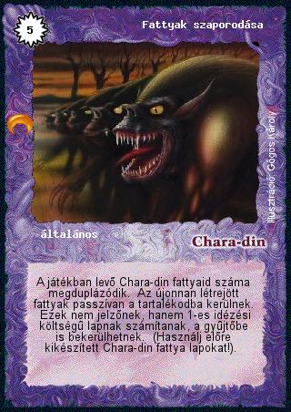 Kiadás: Chara-din visszatér Gyakoriság: gyakori Lapszín (isten): Chara-din Típus: általános Szöveg: A játékban levő Chara-din fattyaid száma megduplázódik. Az újonnan létrejött fattyak passzívan a tartalékodba kerülnek. Ezek nem jelzőnek, hanem 1-es idézési költségű lapnak számítanak, a gyűjtőbe is bekerülhetnek. (Használj előre kikészített Chara-din fattya lapokat!). Illusztráció: Gőgös Károly