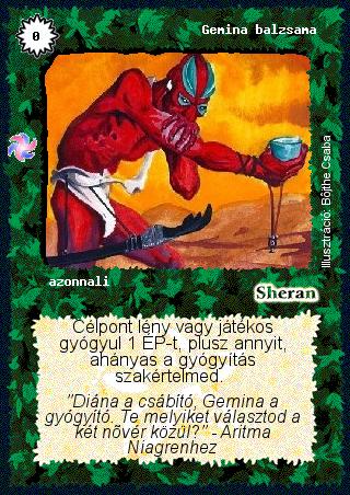 Kiadás: Létsíkok, Túlélők Földje Gyakoriság: gyakori Lapszín (isten): Sheran Típus: azonnali Szöveg: Célpont lény vagy játékos gyógyul 1 ÉP-t, plusz annyit, ahányas a gyógyítás szakértelmed. Szinesítő szöveg: "Diána a csábító, Gemina a gyógyító. Te melyiket választod a két nővér közül?" - Aritma Niagrenhez Illusztráció: Bőjthe Csaba