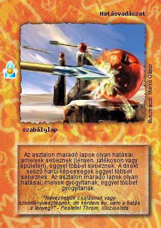 Szöveg: Az asztalon maradó lapok olyan hatásai, amelyek sebeznek (lényen, játékoson vagy épületen), eggyel többet sebeznek. A direkt sebző harci képességek eggyel többet sebeznek. Az asztalon maradó lapok olyan hatásai, melyek gyógyítanak, eggyel többet gyógyítanak.