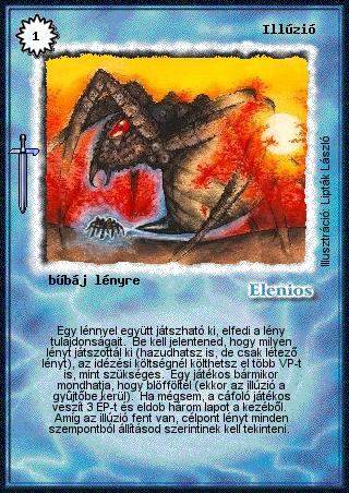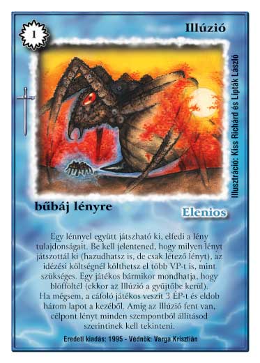 Kiadás: Hőskorszak, Védnök 2023 Gyakoriság: ritka Lapszín (isten): Elenios Típus: bűbáj lényre Szöveg: Egy lénnyel együtt játszható ki, elfedi a lény tulajdonságait. Be kell jelentened, hogy milyen lényt játszottál ki (hazudhatsz is, de csak létező lényt), az idézési költségnél költhetsz el több VP-t is, mint szükséges. Egy játékos bármikor mondhatja, hogy blöfföltél (ekkor az illúzió a gyűjtőbe kerül). Ha mégsem, a cáfoló játékos veszít 3 ÉP-t és eldob három lapot a kezéből. Amíg az illúzió fent van, célpont lényt minden szempontból állításod szerintinek kell tekinteni. Illusztráció: Lipták László