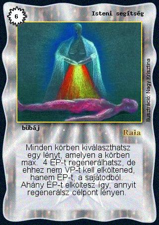 Kiadás: Alappakli, 1. kiadás, Alappakli, 2. kiadás, Alappakli, 3. kiadás, Alappakli, 4. kiadás Gyakoriság: ritka Lapszín (isten): Raia Típus: bűbáj Szöveg: Minden körben kiválaszthatsz egy lényt, amelyen a körben max. 4 ÉP-t regenerálhatsz, de ehhez nem VP-t kell elköltened, hanem ÉP-t, a sajátodból. Ahány ÉP-t elköltesz így, annyit regenerálsz célpont lényen. Illusztráció: Nagy Krisztina