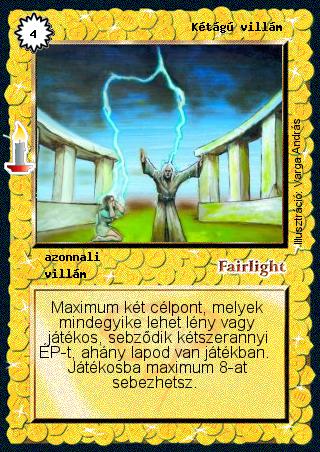 Kiadás: Múltidéző, Alappakli, 8. kiadás Gyakoriság: nem gyakori Lapszín (isten): Fairlight Típus: azonnali Altípus: villám Szöveg: Maximum két célpont, melyek mindegyike lehet lény vagy játékos, sebződik kétszerannyi ÉP-t, ahány lapod van játékban. Játékosba maximum 8-at sebezhetsz. Illusztráció: Varga András