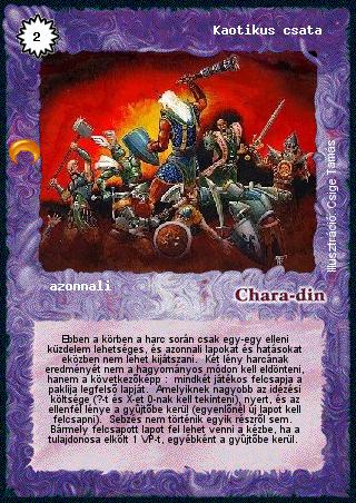 Kiadás: Chara-din visszatér Gyakoriság: ritka Lapszín (isten): Chara-din Típus: azonnali Szöveg: Ebben a körben a harc során csak egy-egy elleni küzdelem lehetséges, és azonnali lapokat és hatásokat eközben nem lehet kijátszani. Két lény harcának eredményét nem a hagyományos módon kell eldönteni, hanem a következőképp: mindkét játékos felcsapja a paklija legfelső lapját. Amelyiknek nagyobb az idézési költsége (?-t és X-et 0-nak kell tekinteni), nyert, és az ellenfél lénye a gyűjtőbe kerül (egyenlőnél új lapot kell felcsapni). Sebzés nem történik egyik részről sem. Bármely felcsapott lapot fel lehet venni a kézbe, ha a tulajdonosa elkölt 1 VP-t, egyébként a gyűjtőbe kerül. Illusztráció: Csige Tamás