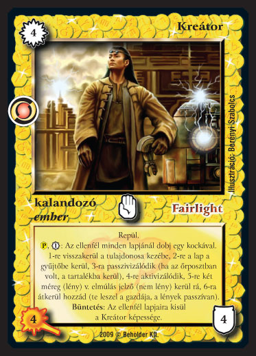 Kiadás: Elözönlés Gyakoriság: ritka Lapszín (isten): Fairlight Típus: kalandozó Altípus: ember Szöveg: Repül. (P), 1_VP: Az ellenfél minden lapjánál dobj egy kockával. 1-re visszakerül a tulajdonosa kezébe, 2-re a lap a gyűjtőbe kerül, 3-ra passzivizálódik (ha az őrposztban volt, a tartalékba kerül), 4-re aktivizálódik, 5-re két méreg (lény) v. elmúlás jelző (nem lény) kerül rá, 6-ra átkerül hozzád (te leszel a gazdája, a lények passzívan). Büntetés: Az ellenfél lapjaira kisül a Kreátor képessége. Illusztráció: Berényi Szabolcs