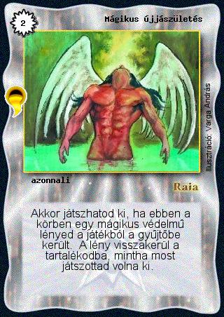 Kiadás: Aranyforrás Gyakoriság: nem gyakori Lapszín (isten): Raia Típus: azonnali Szöveg: Akkor játszhatod ki, ha ebben a körben egy mágikus védelmű lényed a játékból a gyűjtőbe került. A lény visszakerül a tartalékodba, mintha most játszottad volna ki. Illusztráció: Varga András