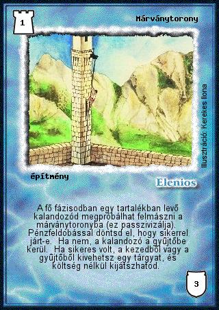 Szöveg: A fő fázisodban egy tartalékban levő kalandozód megpróbálhat felmászni a márványtoronyba (ez passzivizálja). Pénzfeldobással döntsd el, hogy sikerrel járt-e. Ha nem, a kalandozó a gyűjtőbe kerül. Ha sikeres volt, a kezedből vagy a gyűjtőből kivehetsz egy tárgyat, és költség nélkül kijátszhatod.