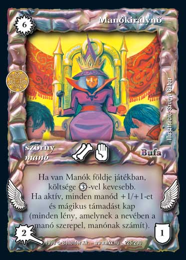 Szöveg: Repül. Ha a Manókirálynő aktív, minden manód kap +1 sebzést, +1 ÉP-t és mágikus támadást. (Minden lény, amelynek a nevében a manó szerepel, manónak számít. ) Ha a Manók földje játékban van, a Manókirálynő kijátszási költsége 3 VP-vel kevesebb.
