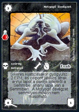 Kiadás: Esthar Császárság, Alappakli, 8. kiadás Gyakoriság: nem gyakori Lapszín (isten): Leah Típus: szörny Altípus: motyogó Szöveg: Sikeres kijátszásakor gyógyulsz 2 ÉP-t, és célpont játékos átrak annyi lapot a paklija tetejéről a Semmibe, ahány lapja van a Semmiben. A Motyogó ősvégzet semmilyen módon nem másolható. Illusztráció: Fischer Tamás