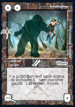 Kiadás: Sárkánymágia Gyakoriság: nem gyakori Lapszín (isten): Tharr Típus: szörny Altípus: gólem Szöveg: X a gyűjtődben levő lapok száma, de legfeljebb 5. Nem cserélhet gazdát. Láthatatlan. Árnyék: 1 VP. Illusztráció: Ruzsinszki Zsolt