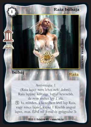 Kiadás: Istenek csarnoka (Zén) Gyakoriság: ritka Lapszín (isten): Raia Típus: bűbáj Altípus: - Szöveg: Anti-mágia: 1 (Raia lapot nem lehet neki dobni). Raia lapjaid költsége 1-gyel kevesebb, de nem mehet így 1 alá. (S): ha minden, a kezedben lévő lap Raia, vagy nincs lapod, kapsz 1 Kisebb angyal lapot, max. ÉP-d nő 3-mal és gyógyulsz 3-at. Illusztráció: Váradi János