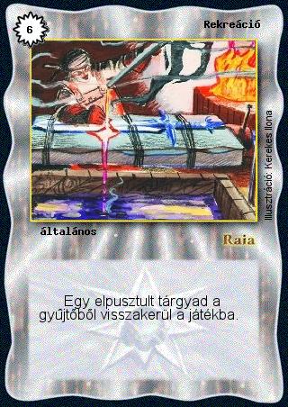 Kiadás: Alappakli, 1. kiadás Gyakoriság: nem gyakori Lapszín (isten): Raia Típus: általános Szöveg: Egy elpusztult tárgyad a gyűjtőből visszakerül a játékba. Illusztráció: Kerekes Ilona