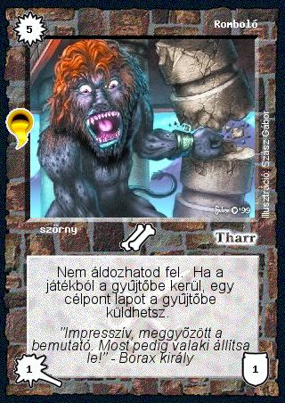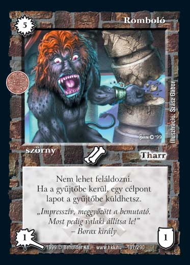 Kiadás: Aranyforrás, Túlélők Földje Gyakoriság: nem gyakori Lapszín (isten): Tharr Típus: szörny Szöveg: Nem áldozhatod fel. Ha a játékból a gyűjtőbe kerül, egy célpont lapot a gyűjtőbe küldhetsz. Szinesítő szöveg: "Impresszív, meggyőzött a bemutató. Most pedig valaki állítsa le!" - Borax király Illusztráció: Szász Gábor