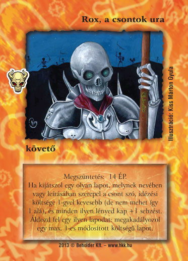 Szöveg: A fő fázisában bármely játékos megszüntetheti 14 max. ÉP és 14 ÉP feláldozásával. Ha kijátszol egy olyan lapot, melynek nevében vagy leírásában szerepel a csont szó, idézési költsége 1-gyel kevesebb (de nem mehet így 1 alá), és minden ilyen lényed kap +1 sebzést. Áldozd fel egy ilyen lapodat: megakadályozol egy max. 1-es módosított költségű lapot.