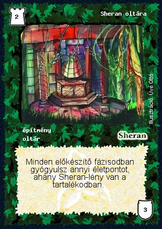 Kiadás: Alappakli, 1. kiadás, Alappakli, 2. kiadás, Alappakli, 3. kiadás, Alappakli, 4. kiadás Gyakoriság: gyakori Lapszín (isten): Sheran Típus: építmény Altípus: oltár Szöveg: Minden előkészítő fázisodban gyógyulsz annyi életpontot, ahány Sheran-lény van a tartalékodban. Illusztráció: Úvé Ottó