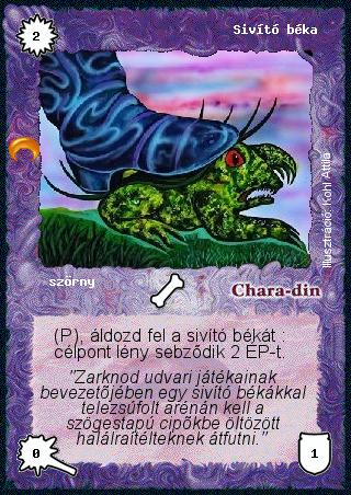Kiadás: Chara-din visszatér Gyakoriság: gyakori Lapszín (isten): Chara-din Típus: szörny Szöveg: (P), áldozd fel a sivító békát: célpont lény sebződik 2 ÉP-t. Szinesítő szöveg: "Zarknod udvari játékainak bevezetőjében egy sivító békákkal telezsúfolt arénán kell a szögestalpú cipőkbe öltözött halálraítélteknek átfutni." Illusztráció: Kohl Attila