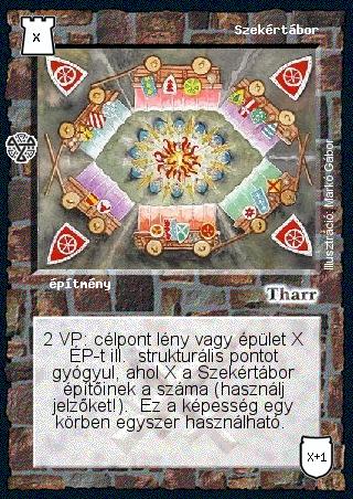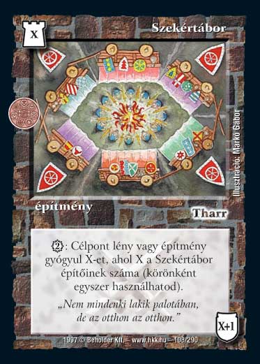 Kiadás: Isteni szövetség, Túlélők Földje Gyakoriság: nem gyakori Lapszín (isten): Tharr Típus: építmény Szöveg: 2 VP: célpont lény vagy épület X ÉP-t ill. strukturális pontot gyógyul, ahol X a Szekértábor építőinek a száma (használj jelzőket!). Ez a képesség egy körben egyszer használható. Illusztráció: Markó Gábor