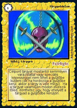 Kiadás: Alappakli, 1. kiadás Gyakoriság: nem gyakori Lapszín (isten): Fairlight Típus: bűbáj tárgyra Szöveg: Célpont tárgyat mostantól semmilyen varázslattal vagy speciális képességgel nem lehet a gyűjtőbe küldeni (de ha hordozója a gyűjtőbe kerül, akkor a tárgy is vele megy). Ha a tárgyat valamilyen módon elveszik tőled, dönthetsz úgy, hogy ehelyett a tárgyad a gyűjtődbe kerüljön. Illusztráció: Udvarhelyi Zsolt