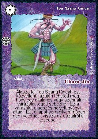 Kiadás: Isteni szövetség Gyakoriság: nem gyakori Lapszín (isten): Chara-din Típus: bűbáj Szöveg: Áldozd fel Tou Szang táncát: ezt közvetlenül azután teheted meg, hogy egy általános vagy azonnali varázslat téged sebezne. Ez a varázslat a sebzés helyett gyógyít rajtad. Ezt a lapot semmilyen módon nem vetethetik vissza az asztalról a kezedbe. Illusztráció: