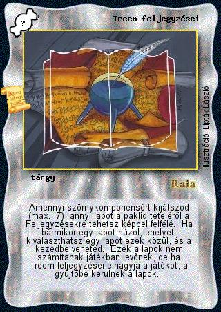 Kiadás: Ezüsthajnal Gyakoriság: ultra ritka Lapszín (isten): Raia Típus: tárgy Szöveg: Amennyi szörnykomponensért kijátszod (max. 7), annyi lapot a paklid tetejéről a Feljegyzésekre tehetsz képpel felfelé. Ha bármikor egy lapot húzol, ehelyett kiválaszthatsz egy lapot ezek közül, és a kezedbe veheted. Ezek a lapok nem számítanak játékban levőnek, de ha Treem feljegyzései elhagyja a játékot, a gyűjtőbe kerülnek a lapok. Illusztráció: Lipták László