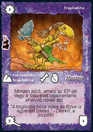 Kiadás: Rúvel hegy Gyakoriság: gyakori Lapszín (isten): Mutáns Klán Típus: torzszülött Altípus: troglodita Szöveg: Minden jelző, amely az ÉP-jét vagy a sebzését csökkentené, ehelyett növeli azt. Szinesítő szöveg: "A troglodita húsa sütve és főzve is egyaránt ízletes." - Dexkill, a pusztító Illusztráció: Mayer László