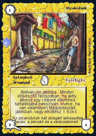 Kiadás: Ezüsthajnal, Túlélők Földje Gyakoriság: gyakori Lapszín (isten): Fairlight Típus: kalandozó Altípus: árnymanó Szöveg: Aktívan jön játékba. Minden előkészítő fázisodban, ha aktív, átkerül egy célpont ellenfeled tartalékjába passzívan, kivéve, ha van valamilyen Mágusiskolád játékban, vagy elköltesz 1 Szk-t. Szinesítő szöveg: "Az utcakölykök két dologért lelkesedtek igazán: a pénzért és a varázslatokért." Illusztráció: Markó Gábor