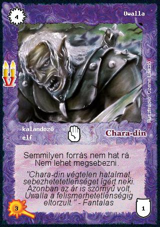 Kiadás: Régmúlt, Alappakli, 8. kiadás Gyakoriság: ritka Lapszín (isten): Chara-din Típus: kalandozó Altípus: elf Szöveg: Semmilyen forrás nem hat rá. Nem lehet megsebezni. Szinesítő szöveg: "Chara-din végtelen hatalmat, sebezhetetetlenséget ígért neki. Azonban az ár is szörnyű volt, Uwalla a felismerhetetlenségig eltorzult." - Fantalas Illusztráció: Czene László