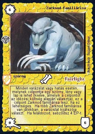 Kiadás: Isteni szövetség Gyakoriság: ritka Lapszín (isten): Fairlight Típus: szörny Szöveg: Minden varázslat vagy hatás esetén, melynek célpontja egy szörny, lény vagy lap is lehet (kivéve, amelyik a célpontot az idézési költség alapján választja), ez a célpont Zarknod familiárisa lesz, ha ez lehetséges. Ha több Zarknod familiárisa van játékban, a varázslat kijátszója választ. Ha feláldozod, sebződsz 4 ÉP-t. Illusztráció: