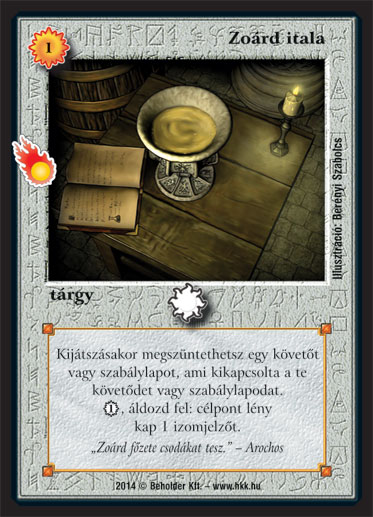 Kiadás: Mágusok Alkonya Gyakoriság: ritka Lapszín (isten): Színtelen Típus: tárgy Szöveg: Kijátszásakor megszüntethetsz egy követőt vagy szabálylapot, ami kikapcsolta a te követődet vagy szabálylapodat. 1_VP, áldozd fel: célpont lény kap 1 izomjelzőt. Szinesítő szöveg: "Zoárd főzete csodákat tesz." - Arochos Illusztráció: Berényi Szabolcs
