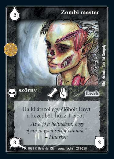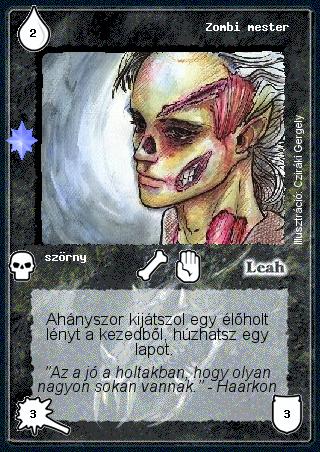 Kiadás: Ezüsthajnal, Védnök 2021, Túlélők Földje Gyakoriság: ritka Lapszín (isten): Leah Típus: szörny Szöveg: Ahányszor kijátszol egy élőholt lényt a kezedből, húzhatsz egy lapot. Szinesítő szöveg: "Az a jó a holtakban, hogy olyan nagyon sokan vannak." - Haarkon Illusztráció: Cziráki Gergely