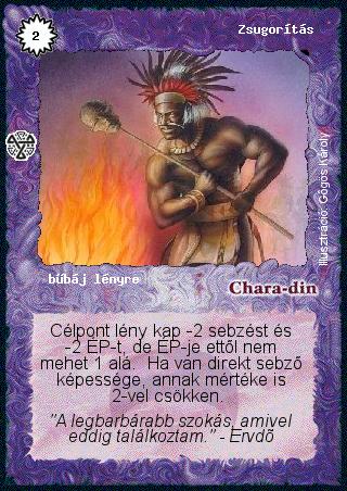 Kiadás: Isteni szövetség Gyakoriság: nem gyakori Lapszín (isten): Chara-din Típus: bűbáj lényre Szöveg: Célpont lény kap -2 sebzést és -2 ÉP-t, de ÉP-je ettől nem mehet 1 alá. Ha van direkt sebző képessége, annak mértéke is 2-vel csökken. Szinesítő szöveg: "A legbarbárabb szokás, amivel eddig találkoztam." - Ervdő Illusztráció: Gőgös Károly