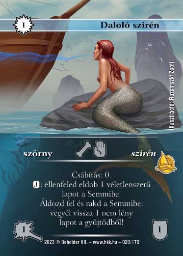 Kiadás: Hódítások Gyakoriság: ritka Lapszín (isten): Elenios Típus: szörny Altípus: szirén Szöveg: Csábítás: 0. (J): ellenfeled eldob 1 véletlenszerű lapot a Semmibe. Áldozd fel és rakd a Semmibe: vegyél vissza 1 nem lény lapot a gyűjtődből! Illusztráció: Ruzsinszki Zsolt