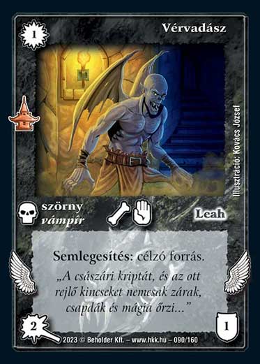 Kiadás: Császárváros Gyakoriság: gyakori Lapszín (isten): Leah Típus: szörny Altípus: vámpír Szöveg: Semlegesítés: célzó forrás. Szinesítő szöveg: "A császári kriptát, és az ott rejlő kincseket nemcsak zárak, csapdák és mágia őrzi..." Illusztráció: Kovács József