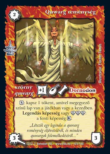 Kiadás: Császárváros Gyakoriság: nem gyakori Lapszín (isten): Dornodon Típus: szörny Altípus: quwarg Szöveg: (S): kapsz 1 tókent, amivel megegyező színű lap van a játékban vagy a kezedben. Legendás képesség vagy _etnikum_etnikum_etnikum: a fenti képesség (K). Szinesítő szöveg: "Létezik egy legenda a quwarg reménység eljöveteléről, és minden quwargok felemelkedéséről..." Illusztráció: Fischer Tamás