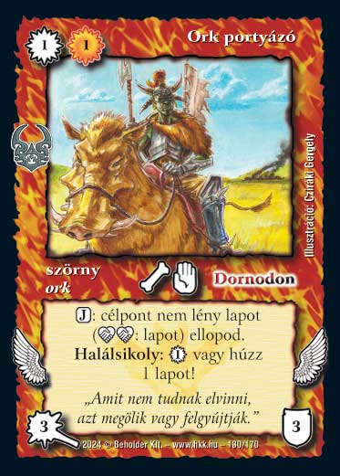 Kiadás: Ősi Káosz Gyakoriság: nem gyakori Lapszín (isten): Dornodon Típus: szörny Altípus: ork Szöveg: (J): célpont nem lény lapot (_etnikum_etnikum: lapot) ellopod. Halálsikoly: 1_VP vagy húzz 1 lapot! Szinesítő szöveg: "Amit nem tudnak elvinni, azt megölik vagy felgyújtják." Illusztráció: Cziráki Gergely