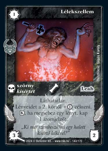 Kiadás: Ősi Káosz Gyakoriság: nem gyakori Lapszín (isten): Leah Típus: szörny Altípus: kísértet Szöveg: Láthatatlan, Lényeidet a 2. körtől +1_VP célozni. (K), ha megsebez egy lényt, kap 1 izomjelzőt. Szinesítő szöveg: "Ki mer szembeszállni egy halott kísértő lelkével?" Illusztráció: Gőgös Károly