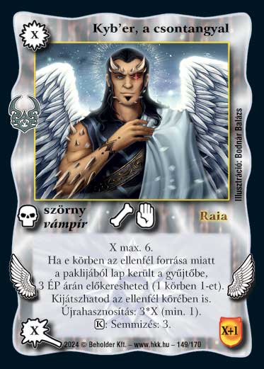 Kiadás: Ősi Káosz Gyakoriság: nem gyakori Lapszín (isten): Raia Típus: szörny Altípus: vámpír Szöveg: X max. 6. Ha e körben az ellenfél forrása miatt a paklijából lap került a gyűjtőbe, 3 ÉP árán előkeresheted (1 körben 1-et). Kijátszhatod az ellenfél körében is. Újrahasznosítás: 3*X (min. 1). (K): célpont gyűjtőből rakj max. 3 lapot a Semmibe! Illusztráció: Bodnár Balázs