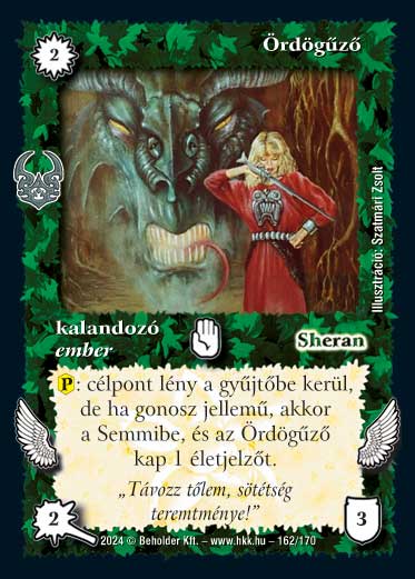 Kiadás: Ősi Káosz Gyakoriság: nem gyakori Lapszín (isten): Sheran Típus: kalandozó Altípus: ember Szöveg: (P): célpont lény a gyűjtőbe kerül, de ha gonosz jellemű , akkor a Semmibe kerül, és az Ördögűző kap 1 életjelzőt. Szinesítő szöveg: "Távozz tőlem, sötétség teremtménye!" Illusztráció: Szatmári Zsolt