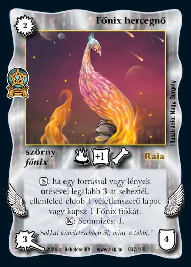 Szöveg: (S), ha egy forrással vagy lények ütésével legalább 3-at sebeztél, ellenfeled eldob 1 véletlenszerű lapot, vagy kapsz 1 Főnix fiókát. (K): Semmizés: 1.